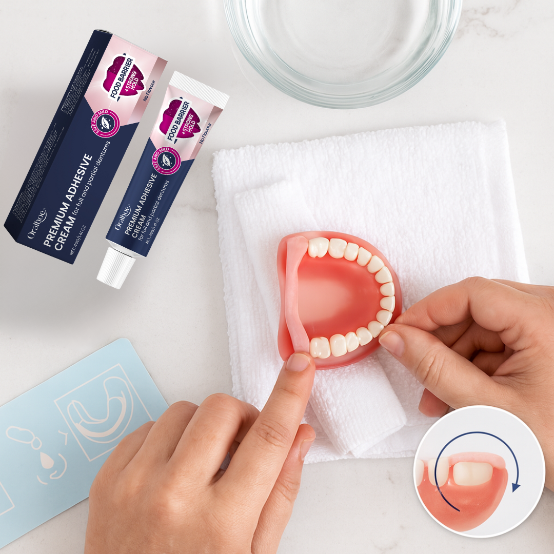 Applicera en liten mängd på rengjord och torr protes innan den sätts på plats. Fästet aktiveras jämnt och håller sig stabilt, vilket låter dig äta, tala och le utan oro eller justeringar.